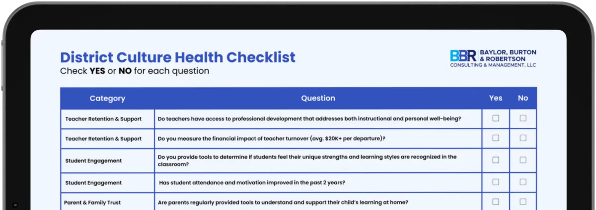 Download our District Culture Health Checklist to identify your district's strengths and red flags.